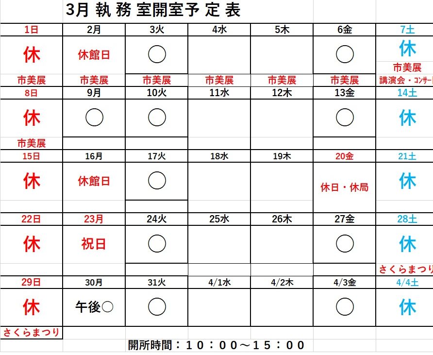 執務室開所日:月・火・金曜日 10:00-15:00